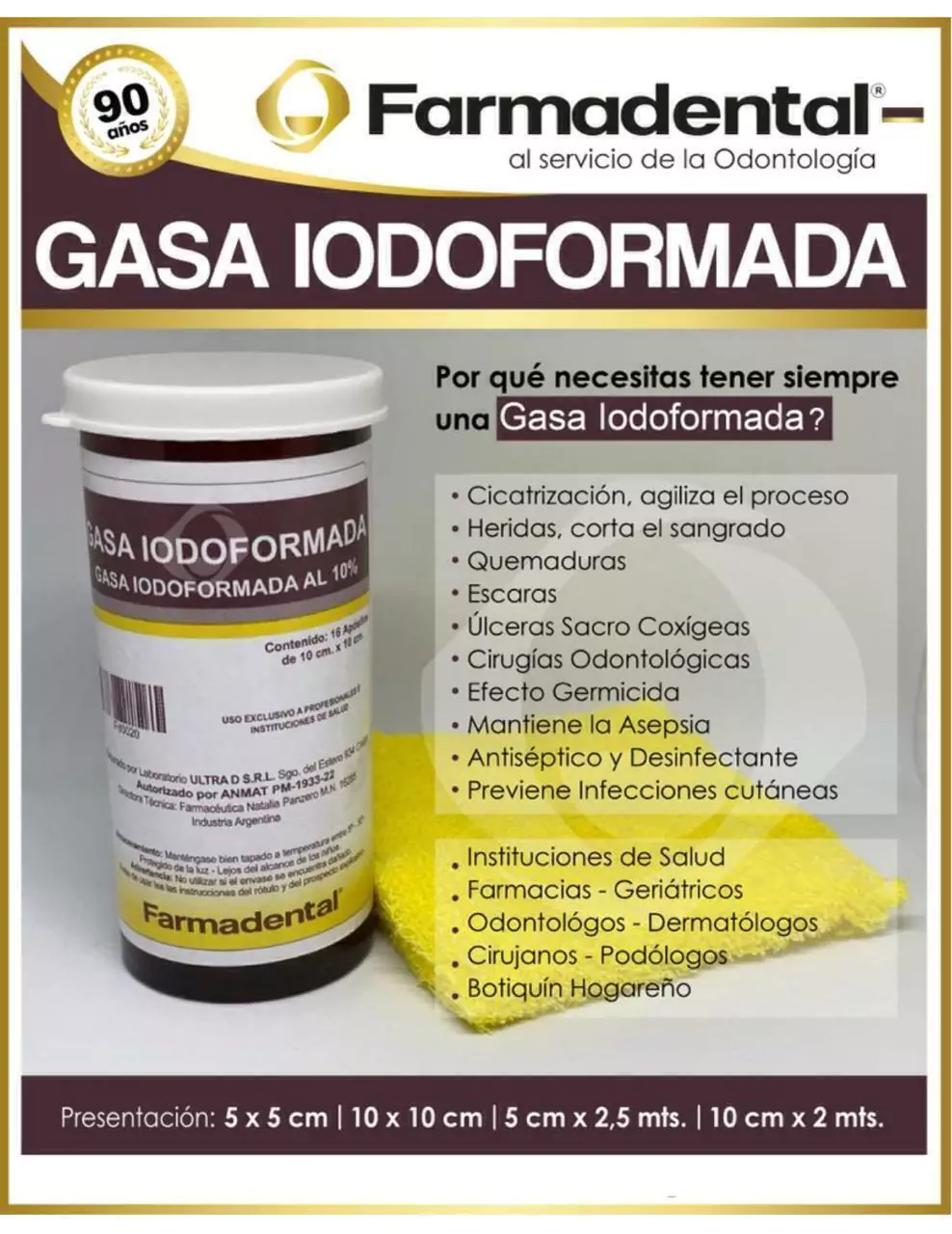 Marca: Farmadental Presentación: 16 apositos Dimensiones: 5 cm x 5 cm Concentración de Yodoformo: 10%