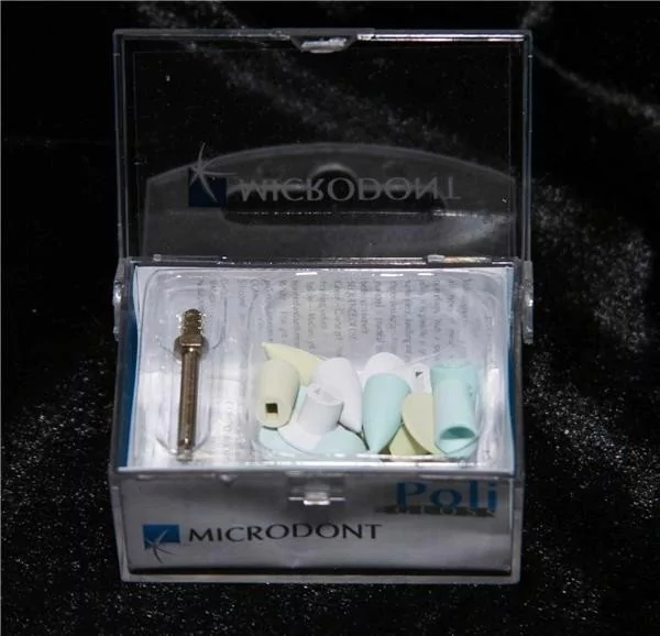| Presentación: 18 puntas de goma + 1 mandril metálico. Kit: 6 copas (granos fino-medio-grueso) + 6 discos (granos fino-medio-grueso) + 6 conos (granos fino-medio-grueso) + 1 mandril metálico |